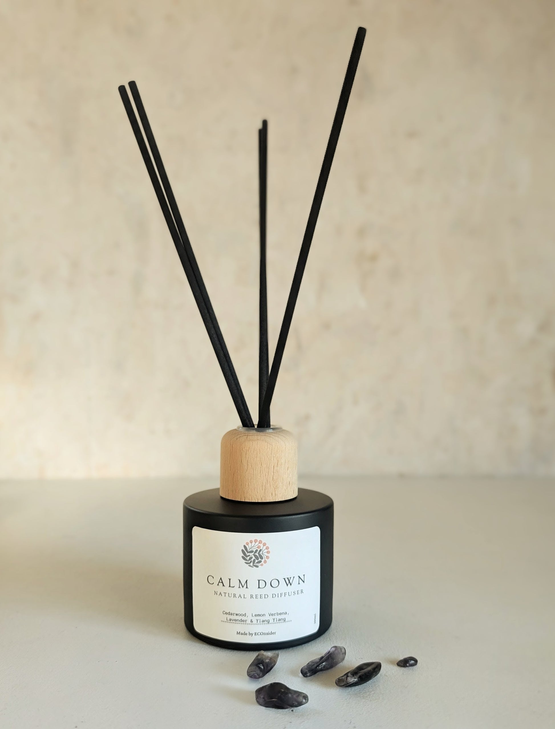 Create a moment of stillness with Calm Down, a natural reed diffuser designed to gently soothe the senses and restore balance. This carefully selected essential oil blend combines Lavender, Cedarwood, Ylang Ylang, and Lemon Verbena to help calm the mind, ease anxiety, and promote restful sleep.